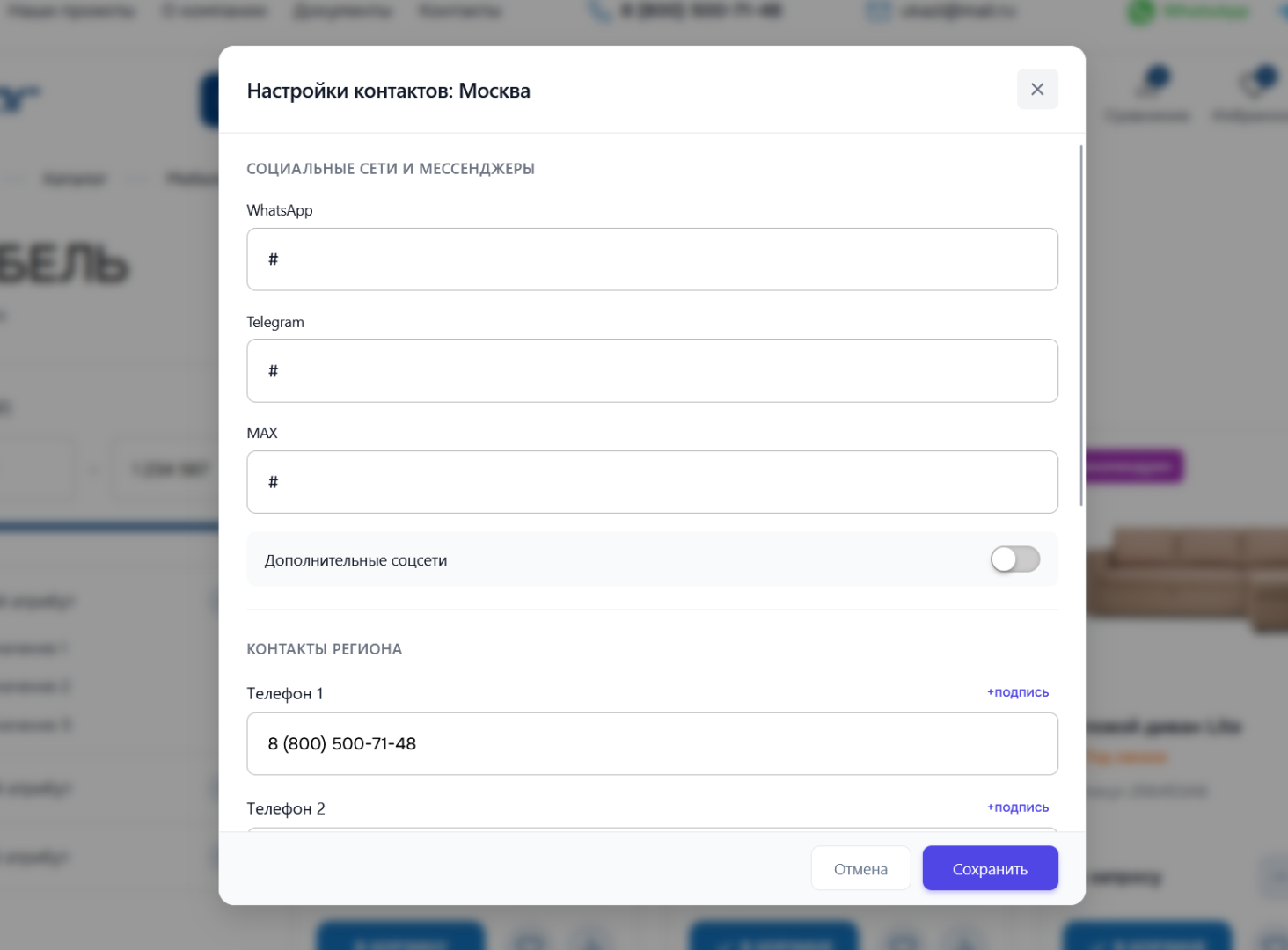 В заголовке окна отображается название региона, для которого вы редактируете контакты (например, «Настройки контактов: Москва»).
